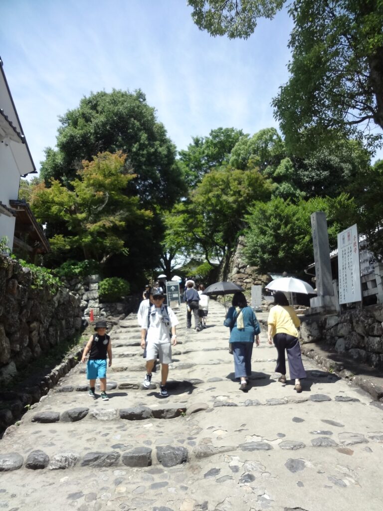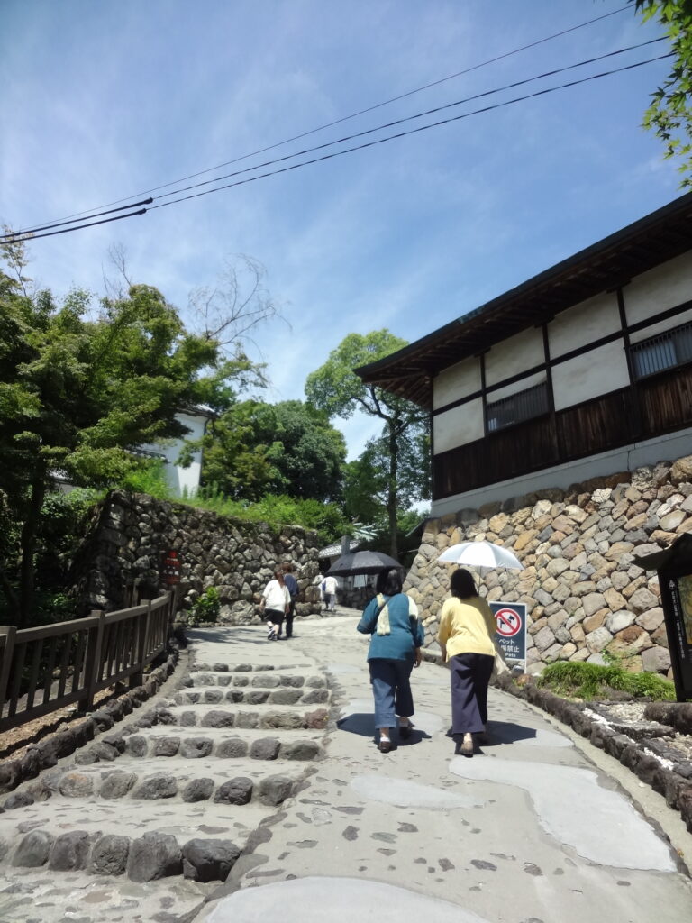 神社の脇を通ってお城へ向かいます。段差が少ないですが、結構急な坂道を登っていきます。