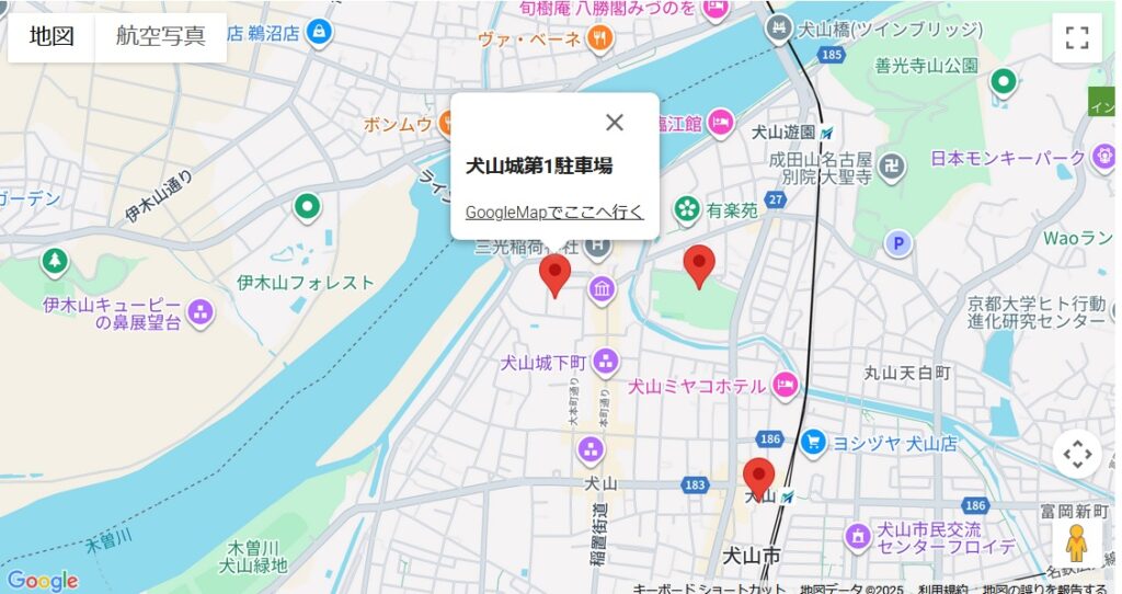 一番近いのが「犬山城第1駐車場」で続いて「犬山城第2駐車場」、「犬山城第3駐車場」です。
